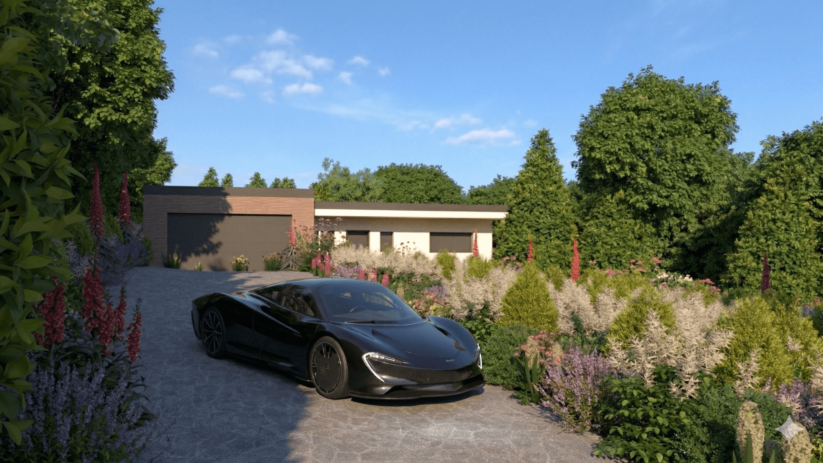 Après avoir structuré l'espace et les volumes paysagers sur SketchUp, j'ai utilisé la puissance du moteur de rendu V-Ray pour définir les jeux de lumière, les ombres portées et la matérialité des surfaces. Pour transcender le rendu traditionnel, j'ai finalisé l'image grâce à une intelligence artificielle, ce qui a permis d'apporter un photoréalisme organique et une texture végétale d'une grande précision. Le résultat final propose une transition douce entre la rigueur architecturale et la poésie sauvage du jardin.
